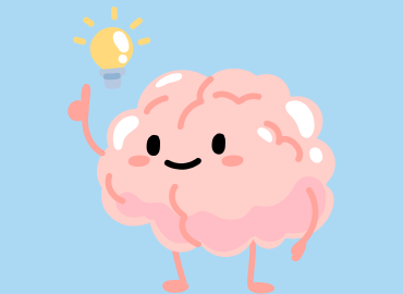 A cartoon smiling brain pointing up at a lightbulb